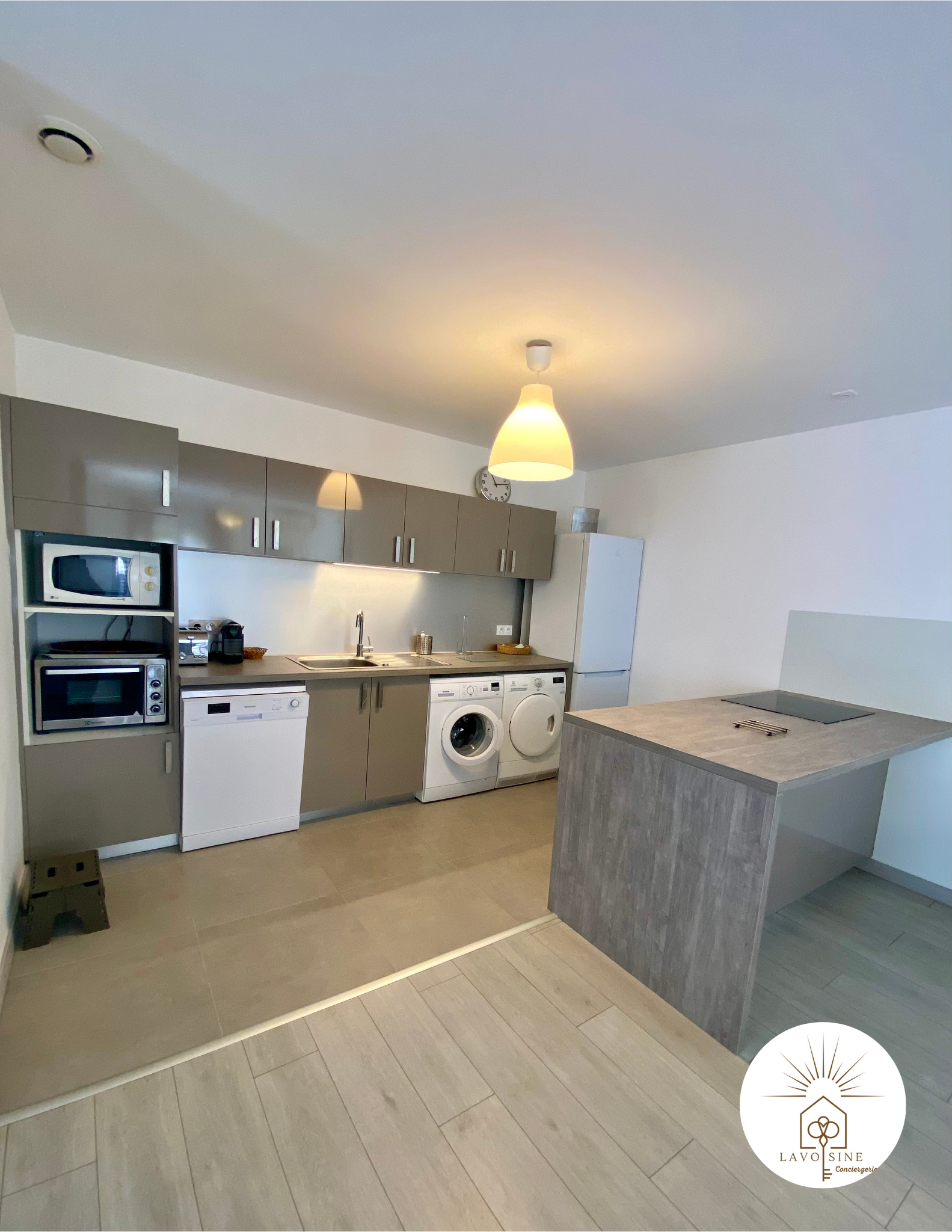 Cuisine équipée ouverte, plaques induction, four, four micro-ondes, lave vaisselle, lave linge, sèche linge, réfrigérateur, congélateur, cafetière, grille pain. Climatisation réversible.